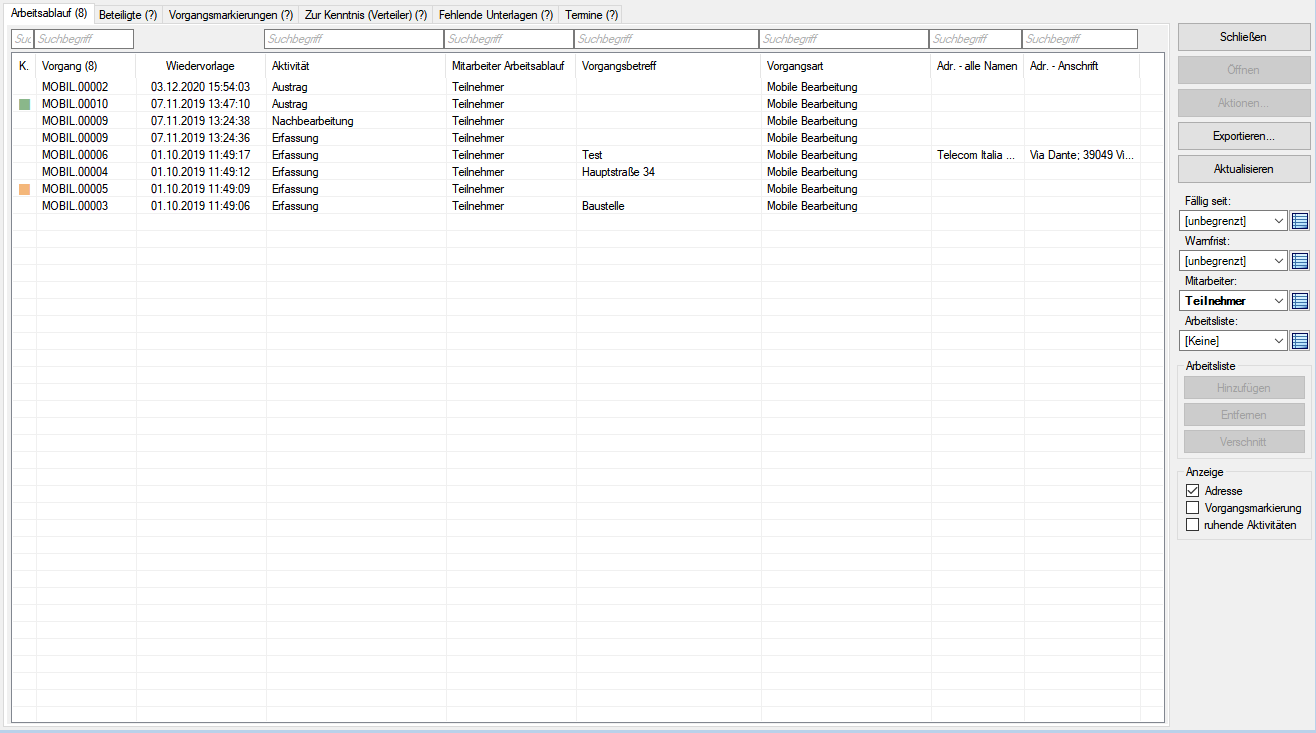 Mit der Wiedervorlage organisieren Sie effizient Ihre tägliche Arbeit. Alle Vorgänge, die für Sie zur Bearbeitung anstehen, werden übersichtlich aufgelistet. Die Einhaltung der definierten Fristen zwischen den Verfahrensschritten bzw. Projektstufen wird vom System automatisch überwacht und dargestellt. Zusätzlich können Sie über die Funktion der Arbeitslisten noch zu erledigende Tätigkeiten strukturieren.